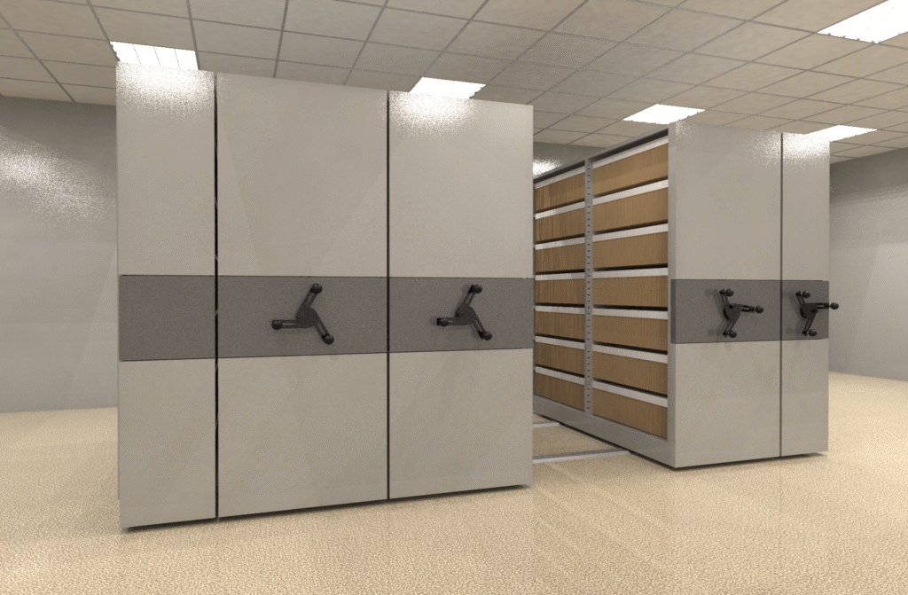 Por meio de um mecanismo de deslocamento lateral sobre trilhos, o sistema permite o acesso rápido e ergonômico aos arquivos, eliminando corredores desnecessários e aproveitando ao máximo o espaço disponível.